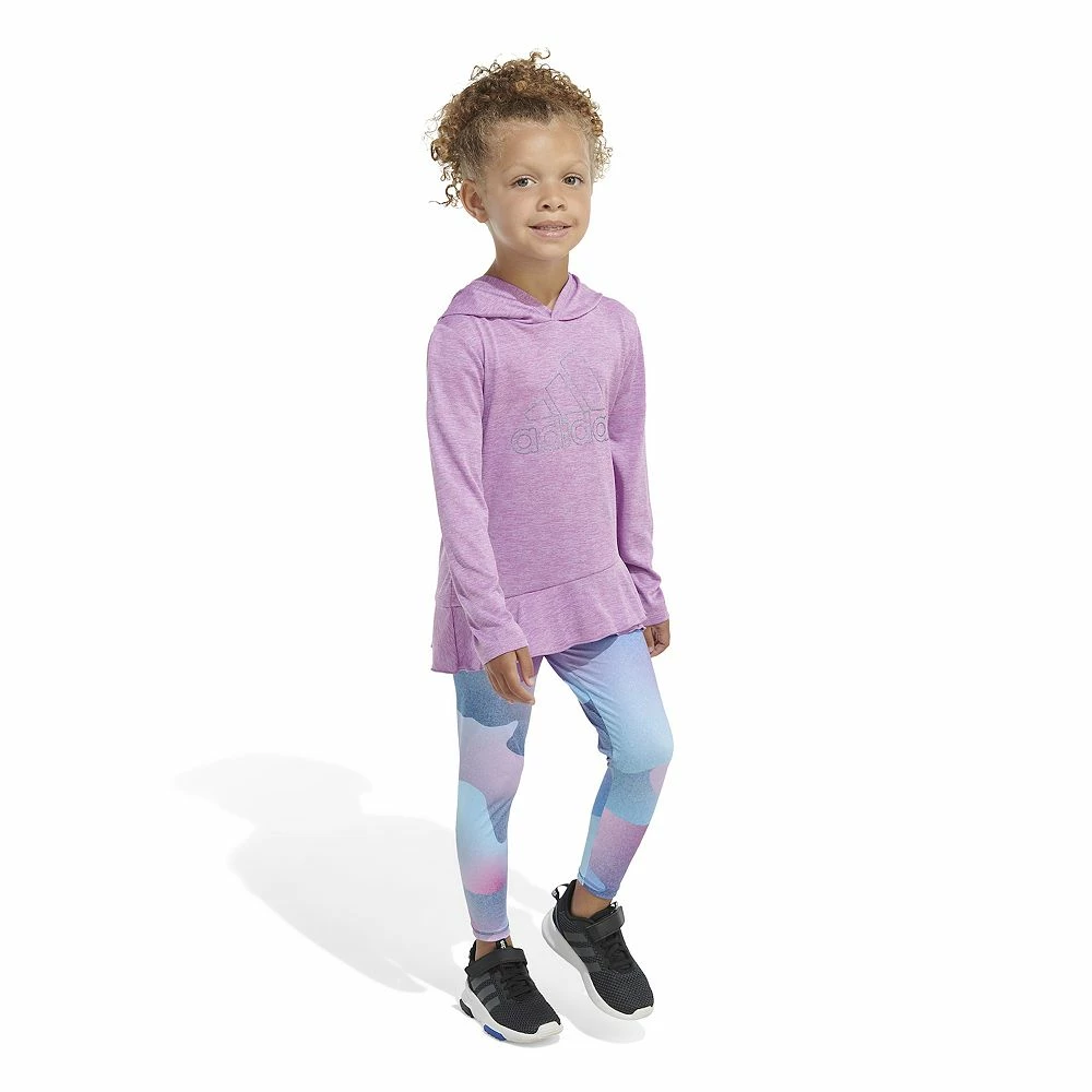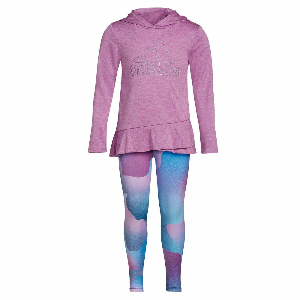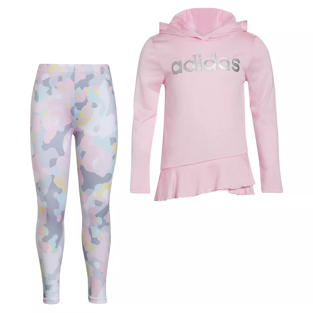 - A ruffled hem and an adidas logo on the hooded tee add the shimmer.