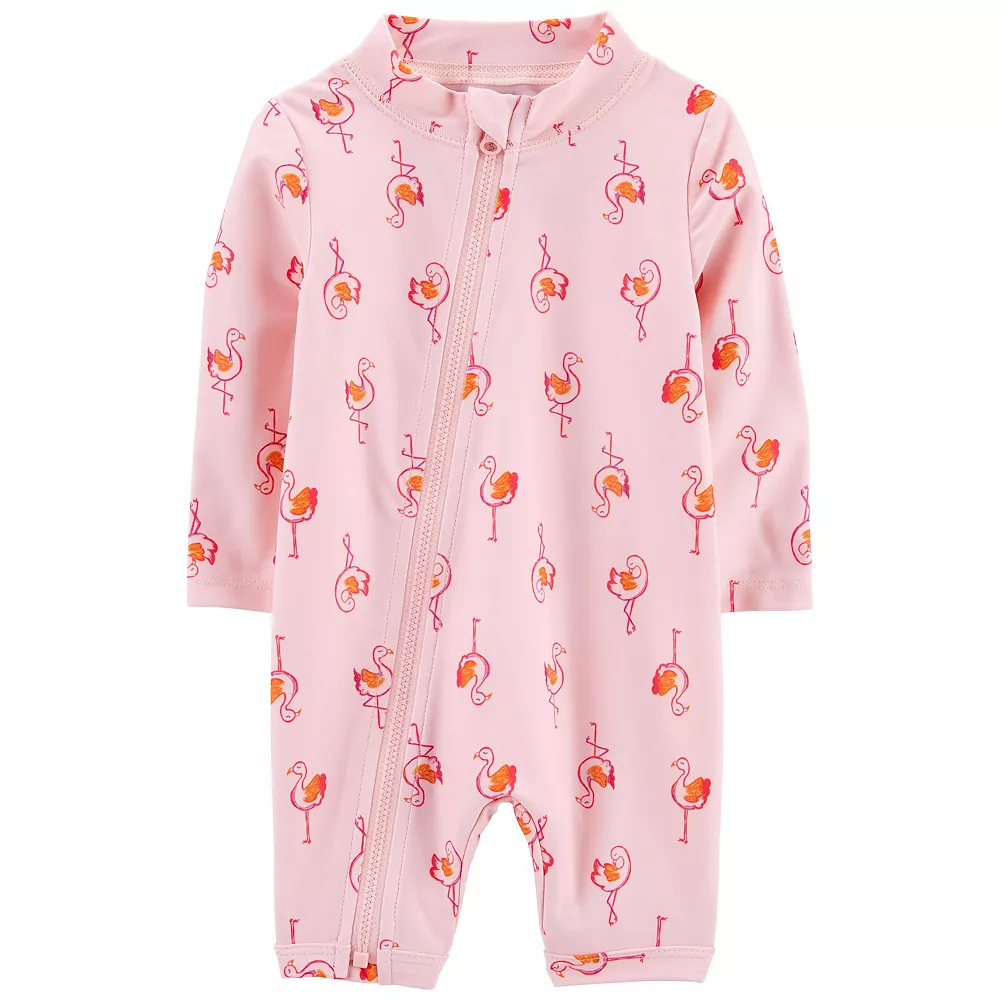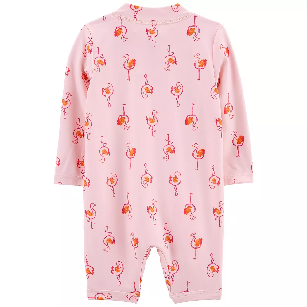 Your little one will have fun in the sun wearing this Toddler Girl Carter’s Flamingo 1-Piece Rashguard.
