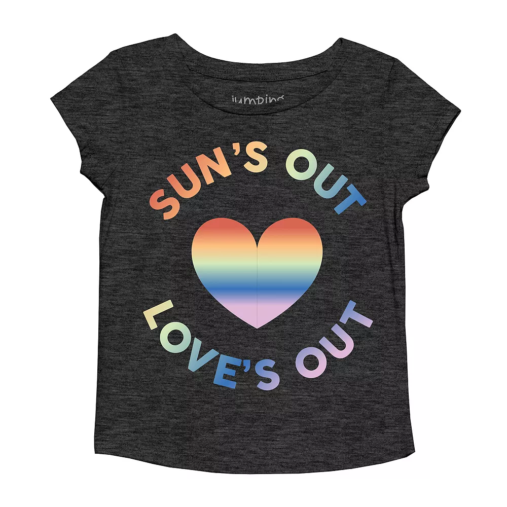 Make a statement during Pride Month—and all year long—with this toddler girls’ rainbow “Sun’s Out, Love’s Out” graphic tee from Jumping Beans.