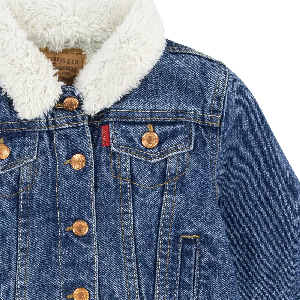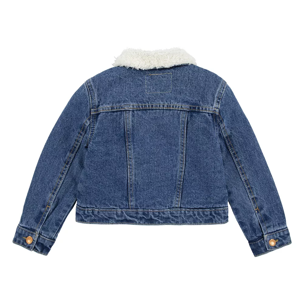 Cozy comfort meets cool style on this girls’ sherpa denim trucker jacket from Levi’s.